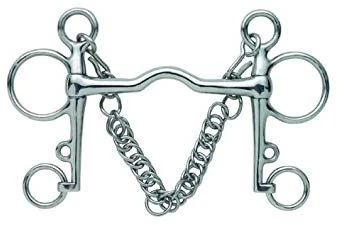The low port pelham is often known as a Cambridge mouth pelham, and can be good to use on horses with a large tongue or small mouth. The very low port of this pelham bit gives space for the tongue, with no collapse on the bars and no real palate pressure. Pelhams are designed to be used with two reins, the ‘snaffle’ rein on the larger ring which should have a constant contact, and the curb rein is attached to the smaller loose bottom ring and is used when needed. The small hole in the shank just above the curb ring is for a lip strap, not essential but correct for showing and helps to keep the curb chain flat. If the rider wishes to use only one pair of reins, roundings can be used to join the snaffle and curb rings together and the reins go on the loop of leather to give an action on both mouthpiece and curb when the rein is pulled.