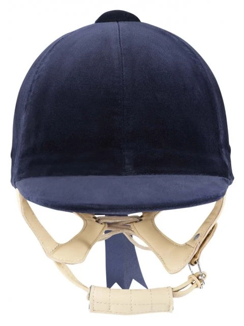 Our new CPX Showmaster Helmet is the perfect choice for discerning riders who want style, substance and classic good looks for the show ring and beyond. Covered in luxury navy velvet with a coordinating ribbon and satin half liner, this helmet is supremely stylish and incredibly comfortable. The hat features a soft, supple four point harness in nude leather that laces for adjustability and fastens with a discrete chrome hook.