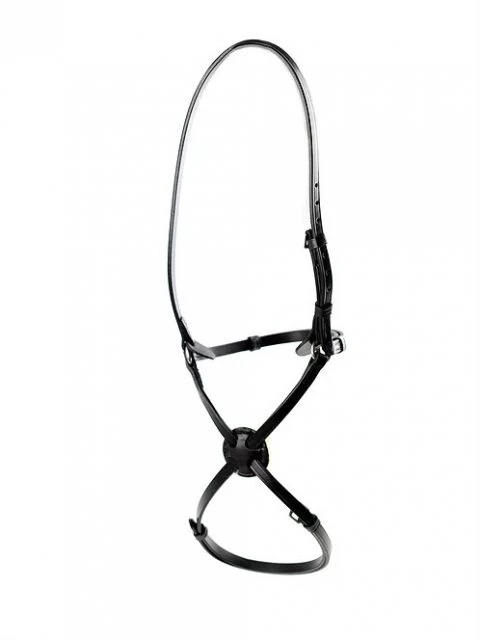 Featuring leather discs behind the rings to help prevent the ring rubbing the cheek bones. It is used to remind the horse to keep its mouth closed and prevents him from crossing his jaw, but provides more expansion of the nostrils, which is preferable for horses performing work involving galloping. Should be fitted higher than a normal Grackle, above the cheek bones.