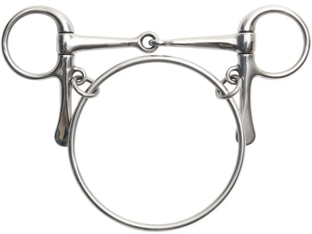 The Shires Dexter ring bit is widely used in racing, and is useful for strong horses. The ring on the dexter bit is also useful for safely leading a high spirited horse whilst tacked up. The bit is a jointed mouthpiece giving a nutcracker action, but is limited as it is attached to the ring in 3 places. The half spoon bottom to the cheek of the dexter ring bit, helps to improve steering and prevent the bit from being dragged through the horses mouth.