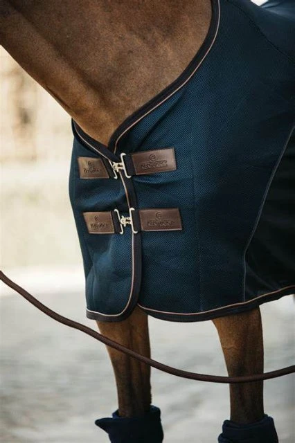The Mesh Combo Cooler Sheet can be used for multiple purposes in the field, at the stable and during transport. Ideal for cooling down thanks to its very light and breathable fabrics. This also makes the rug perfect for drying your horse after training or bathing during spring or summer. The cooler sheet is a combination of the fly sheet and the 3D spacer. On the back part: the 3D spacer, a light but strong honeycomb structure, will absorbs the sweat while keeping your horse dry. On the lower part: the Mesh fly sheet fabric does not only prevent bugs from bothering your horse but will also help air circulation. Which will gradually cool your horse down. The materials used for the Mesh Combo are specially designed, so hair doesn’t stick to it. which makes the cooler sheet very comfortable to wear. The rug is anatomically shaped at the back and has a flat-lined shoulder to make the rug fit nicely to the shape of the horse. For extra comfort, we added artificial sheepskin at the withers and removable surcingles. So, you can easily turn the rug into a showrug by removing the detachable surcingles. Additionally, we added our signature brown piping and the Kentucky logo in artificial leather for a luxurious look. – Absorbs sweat and water, while keeping your horse warm – Fits nicely to the shape of the horse – Hair doesn’t stick to the rug – Luxurious look and feel – 3D spacer technology Care guide for the Mesh Combo Cooler Sheet: You can easily machine wash the Mesh Combo Cooler Sheet at 30°. Do not tumble dry afterwards.