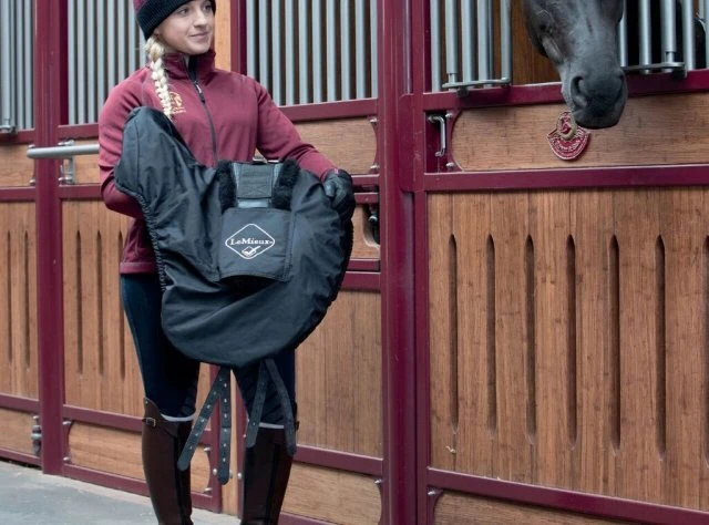 LeMieux ProKit saddle cover is made of a durable polyester outer with a soft fleece lining to protect the saddle.