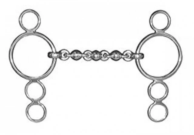 This Dutch gag has a Waterford mouth made of many different links which makes it hard for the horse to take hold of and pull against it. The gag cheeks add leverage. This can be a severe bit. The 5″ and smaller sizes of this bit come with shorter cheeks to ensure the bit remains in proportion with the smaller head. Mouthpiece thickness: 18mm. Cheek height: 150mm (4.5″, 5″), 180mm (5.5″, 6″).