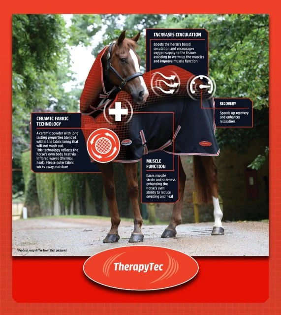 The WeatherBeeta ComFiTec Channel Quilt With Therapy-Tec Detach-A-Neck is the perfect choice for your horse both pre and post workout or whilst your horse is resting in the stable. Therapy Tec is designed to increase your horse’s muscle function to reduce the risk of injury whilst warming up, by preparing the muscles for exercise. Also assists with recovery after work by reducing lactic acid build up which can decrease recovery time and improves the healing process of prior injuries. With a 600 denier channel quilted outer, warm 220g polyfill; ceramic lining over the neck, shoulders, back and quarters; traditional side gussets for natural movement; memory foam wither relief that contours to the horse’s shape & lifts the rug off the withers; Ezi-clip front closure with touch tape, quick and easy to use; low cross surcingles and tail cord. *Not recommended for in foal mares.